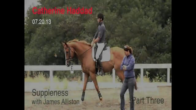 Part 3: Catherine notes the mare is stiffening her back and then becoming resistant to the aides. She coaches the rider to keep her between the hand and the leg, and to use shoulder in and shoulder fore to supple her. The rider works on carrying their hands, and avoiding old habits of losing soft...