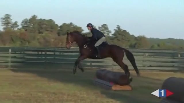 Part 5: The group works through a line of fences including a bounce bank, and a show jump. Jonathan rides through first, and again discusses his ride and uses it to help set objectives for the others. The riders have to focus and fight hard to maintain their line while riding through he almost gy...