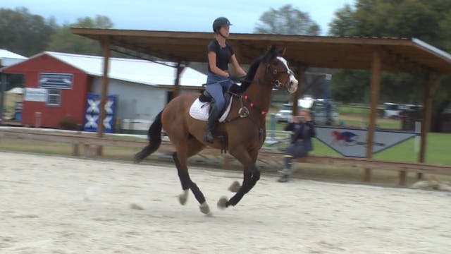 Ashley Johnson works with a rider who’s moving up to Preliminary Level. They want to keep the horse's steps and jumps relaxed. Because the horse is so distracted, they immediately put him to work, creating an even contact and bending his rib cage around her leg. They do transitions within the tro...