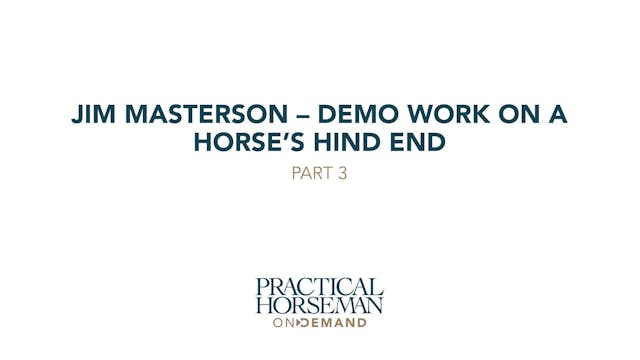 Jim continues working on the hind end of the older horse. Here he demonstrates working with the lower legs to help the pelvis relax. He also reminds people to watch the horse's ears to judge how receptive the horse is to work on the hind legs. By being careful and paying attention to the horse's ...