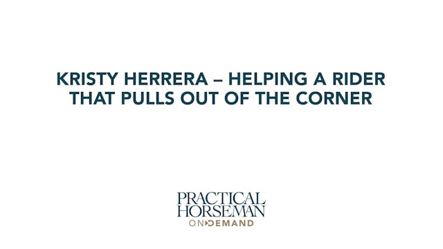 Kristy McCormack (Herrera) explains and has a rider demonstrate how to help fix a rider that "pulls out of the corner." They start with cantering a ground pole and go to jumping a small fence. The focus is on having the rider get used to a forward hand position with a soft rein coming out of the ...