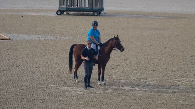 Grand prix jumper rider Kama Godek coaches a rider warming up over a vertical and oxer on a large circle. The rider can spiral in slightly to adjust the distance, and using an opening rein over the fence encourages the horse to land on the correct lead. Kama, a 5* FEI jumper rider, holds a USHJA ...