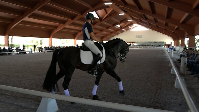 To finish the ride, they school trot work, including some half-steps, passage and half pass. When asking for cadence in the passage, Steffen still wants the horse to be forward thinking. The steps should be shorter, but higher than the working trot. Anytime the horse gets flat, the rider can thin...