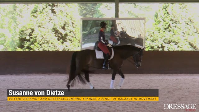 Susanne works with this rider and her nice young horse to help him find the outside rein without restricting the outside bend. They also work on a three-corner exercise, which helps prepare the inside hind leg for collection and the outside shoulder for extension.