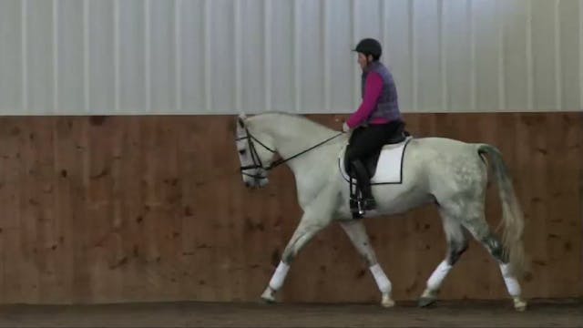 Lilo asks for a more upward thinking canter to finish the canter work. She explains that as the horse struggles to learn, some set backs will occur, and the rider must analyze why they happen and use the correct exercise to solve the issue.